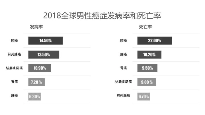 男性中,肺癌发病率(14.5%)和死亡率(22%)最高。男性癌症发病率其次分别是前列腺癌(13.5%)、结肠直肠癌(10.9%)、胃癌(7.2%)、肝癌(6.3%),死亡率其次则分别是肝癌(10.2%)、胃癌(9.5%)、结肠直肠癌(9%)、前列腺癌(6.7%)。