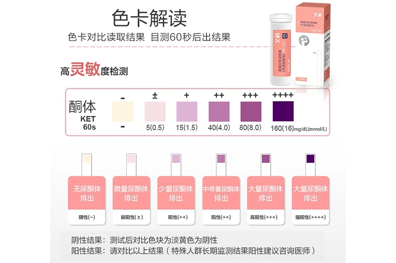 健康人尿液酮体定性为阴性。当饥饿、减肥、脱水、麻醉、呕吐、碱丢失时均可导致有机酸增多,缩合成酮体自尿液排出。糖尿病酮症酸中毒、非糖尿病性酮症(如应激状态、剧烈运动、禁食过久、感染性疾病、严重腹泻、呕吐等)、中毒(氯仿、乙醚、磷等)和药物(双胍类降糖药)影响等可导致尿酮体阳性。