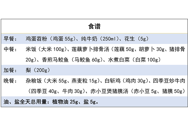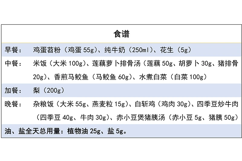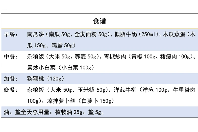 本食谱可提供1600-2000kcal。蛋白质80-120g,碳水化合物220-300及脂肪46-58g。