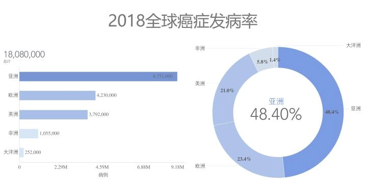 2018年全球预计有1810万癌症新发病例和960万癌症死亡病例(全球所有年龄段、性别,包括非黑色素瘤皮肤癌在内的所有癌症发病比例的推算数据)。