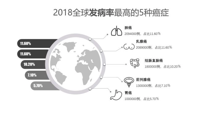 全球新发癌症发病率最高的依次为:肺癌(11.6%)、乳腺癌(11.6%)、结肠直肠癌(10.2%)、前列腺癌(7.1%)、胃癌(5.7%);