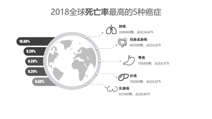 全球死亡率最高的癌症依次为:肺癌(18.4%)、结肠直肠癌(9.2%)、胃癌(8.2%)、肝癌(8.2%)、乳腺癌(6.6%)。