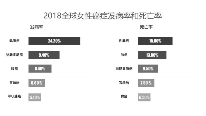 女性中,乳腺癌发病率(24.2%)和死亡率(15%)最高。女性癌症发病率其次分别是结肠直肠癌(9.4%)、肺癌(8.4%)、宫颈癌(6.6%)、甲状腺癌(5.1%),死亡率其次分别是肺癌(13.8%)、结肠直肠癌(9.5%)、宫颈癌(7.5%)、胃癌(6.5%)。