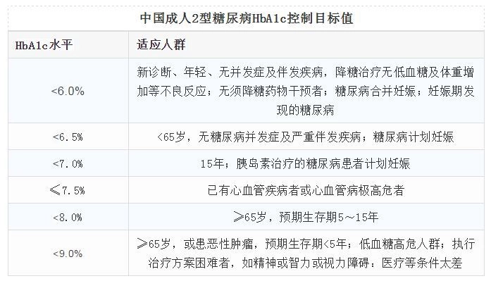 HbA1c的控制范围应因人而异,也不能一概而论。中华医学会内分泌学分会在2011年发布了《中国成人2型糖尿病HbA1c控制目标的专家共识》,根据患者的年龄、糖尿病并发症、伴发病、治疗方案等因素给出了不同的目标值。