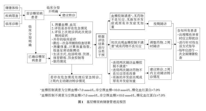 基层医疗卫生机构应承担糖尿病的健康教育、筛查、诊断、治疗及长期随访管理工作,识别出不适合在基层诊治的糖尿病患者并及时转诊。管理的目标是血糖、血压、血脂控制达标,减少并发症的发生,降低致残率和早死率。.