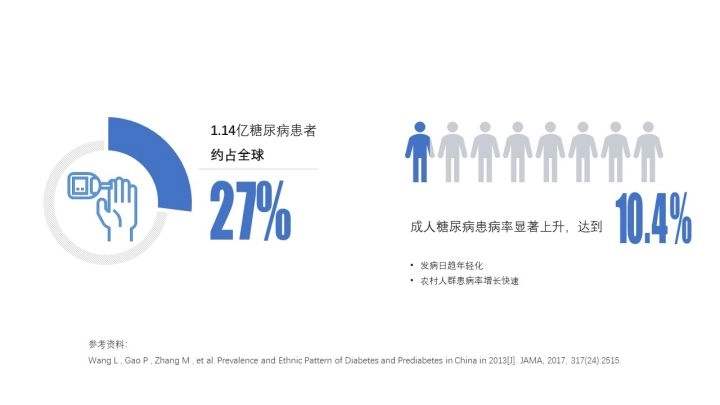 截至到2018年,我国约有1.14亿糖尿病患者,约占全球糖尿病患者的27%,已成为世界上糖尿病患者最多的国家。其中成人糖尿病患病率显著上升,已达到10.4%,随着生活水平提高,糖尿病发病日趋年轻化,农村人群患病率增长快速。