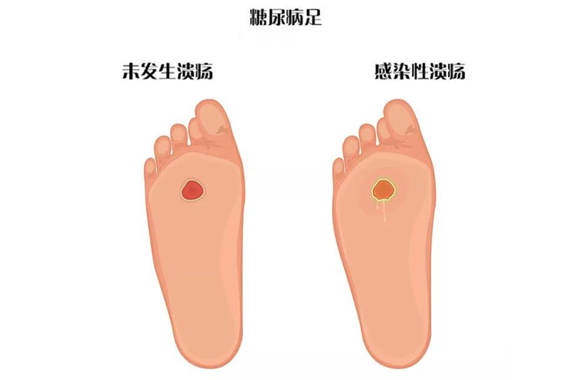 皮肤干燥、麻木、痛觉不明显,行走时有棉花感,可导致溃疡、坏疽。