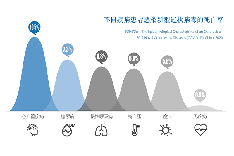 研究指出:感染新冠病毒的心血管疾病患者中死亡率是10.5%,而糖尿病患者的死亡率是7.3%,慢性呼吸病患者的死亡率是6.3%,高血压患者的死亡率是6%,癌症患者的死亡率是5.6%,没有疾病的人是0.9%。患有糖尿病的患者在感染新冠病毒后的死亡率较无疾病人群高了5.9%。