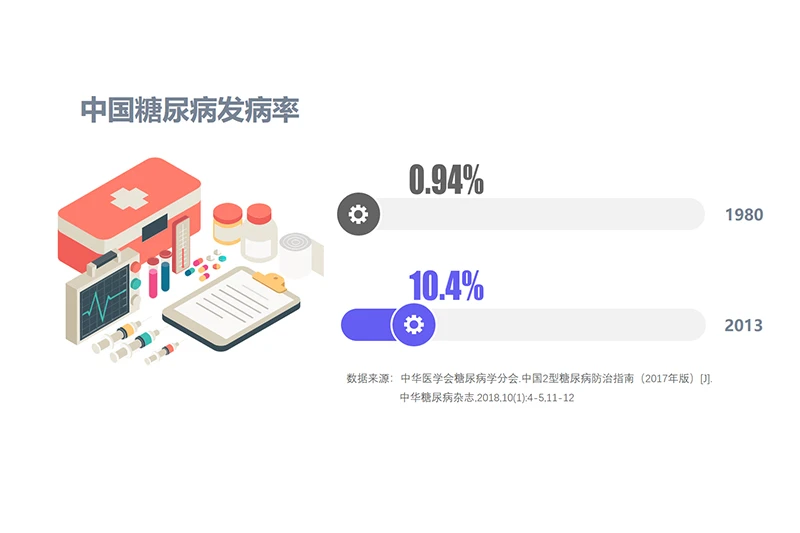 近三十多年来,随着我国经济的高速发展、生活方式西方化和人口老龄化,肥胖率上升,我国糖尿病患病率也呈快速增长趋势,发病率也由1980年的0.67%飙升至2013年10.4%,每10个成年人就有一个是2型糖尿病。然而未诊断的糖尿病患者占总数的63%,接受治疗者血糖达标情况也并不理想,仅1/3的糖尿病患者血糖达标,为糖尿病并发症的发生埋下了土壤。