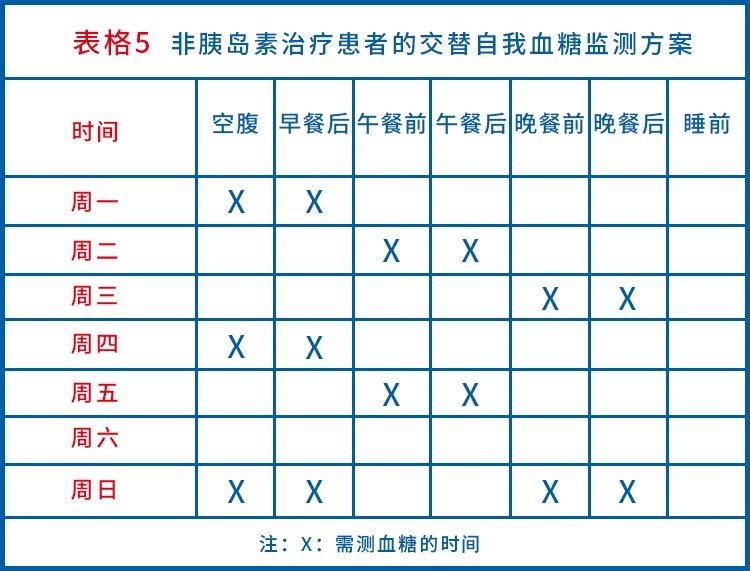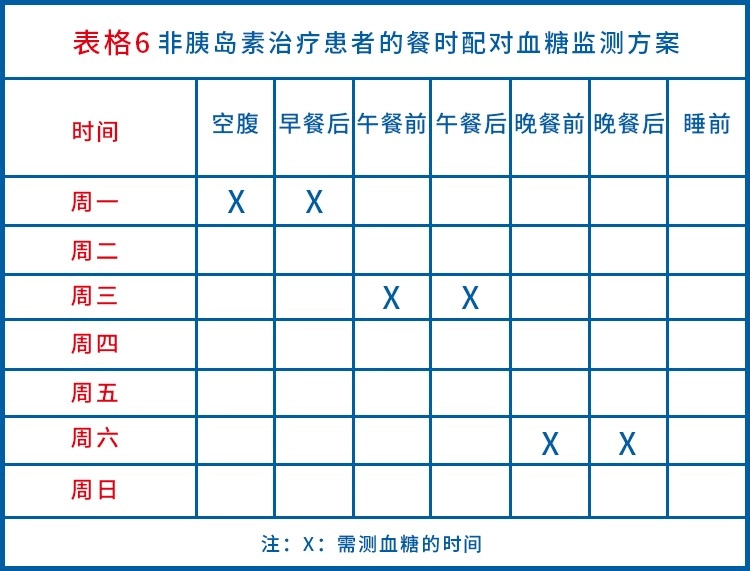 每个糖尿病患者的血糖治疗方案不同,监测血糖的方案不同,但每周都需要监测。《中国血糖监测临床应用指南(2015年版) 》针对不同治疗方案的糖尿病患者给出了相应的血糖监测频率表,供读者参考。