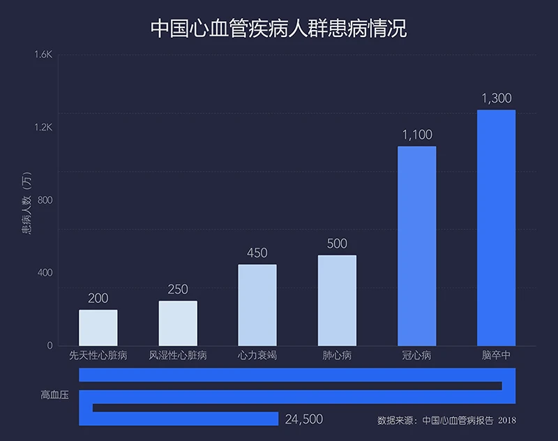 心血管疾病包括冠心病(心脏病发作)、脑血管疾病(中风)、血压升高(高血压)、周围动脉血管疾病、风湿性心脏病、先天性心脏病和心力衰竭。根据《中国心血管病报告2018》数据显示,截止至2016年,心血管疾病现患人数高达2.9亿。其中脑卒中1300万,冠心病1100万,肺心病500万,心力衰竭450万,风湿性心脏病250万,先天性心脏病200万,高血压2.45亿。