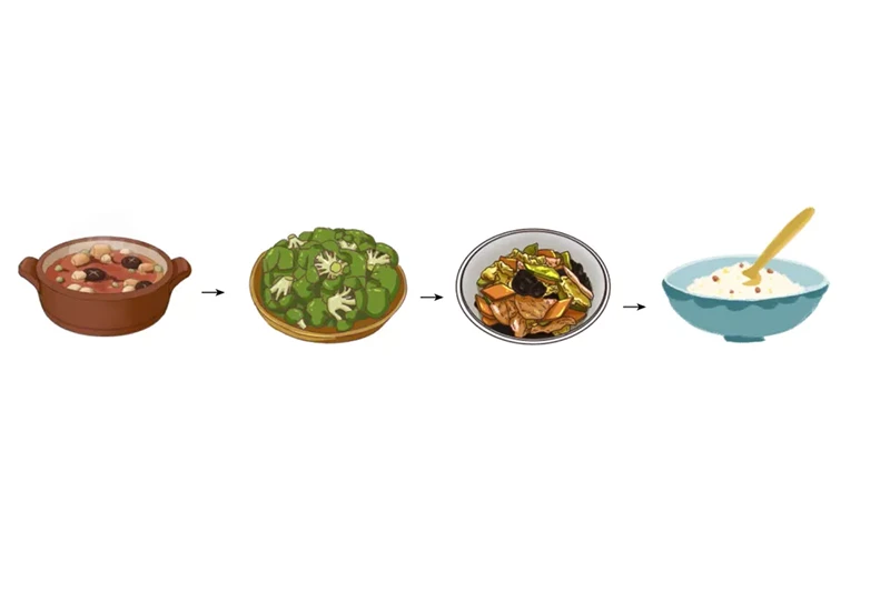 先喝温水或清淡的汤可以润滑消化道,充盈肠胃,增加饱腹感,然后食用蔬菜和肉类,其富含膳食纤维、蛋白质,可以延缓碳水化合物的胃排空时间,减缓升高血糖的速度,随之刺激内源性胰岛素分泌减少,进而减轻胰岛素抵抗,降低糖尿病的发病风险;膳食纤维和蛋白质也可增加饱腹感,对控制总能量和营养素的摄入也有一定的帮助;先吃肉类可促进肠促胰素(GLP-1可以依赖葡萄糖形式促进胰岛素分泌、抑制胰高血糖素分泌,具有增加饱腹感、延迟胃排空的作用)的分泌,从而有助于餐后血糖的管理,最后食用主食。