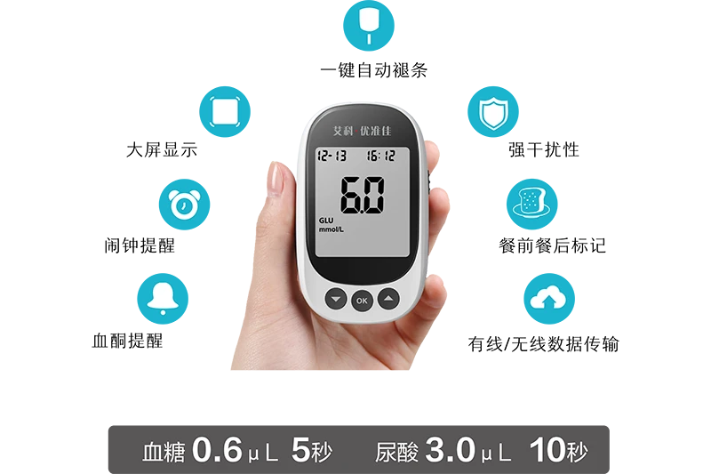 此外,艾科血糖尿酸测试仪操作简便、一键自动退条,避免交叉感染,测量血糖尿酸时插条自动识别,支持手指毛细血管和静脉全血检测,并且满足大家对尿酸检测精准度的高要求。
