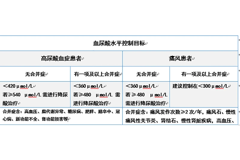 专家建议,对于无其他疾病的高尿酸血症患者,当血尿酸>540μmol/L时,应立即启动降尿酸药物治疗;如果合并高血压、糖代谢异常、冠心病、心力衰竭等情况,患者血尿酸>480μmol/L,应启动降尿酸药物治疗。