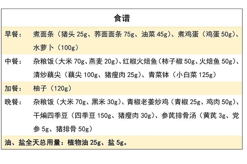 本食谱可提供1600-2000kcal。蛋白质80-120g,碳水化合物220-300及脂肪46-58g。