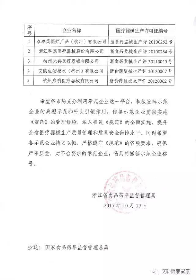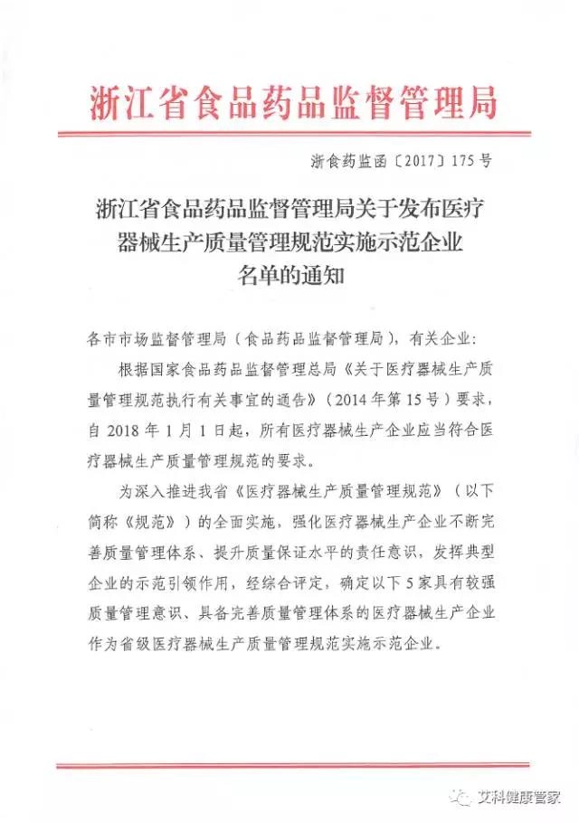 浙江省食品药品监督管理局2017年10月27日发布了《浙江省食品药品监督管理局关于发布医疗器械生产质量管理规范实施示范企业名单通知》,艾康生物技术(杭州)有限公司被省局评定为医疗器械生产质量管理规范实施示范企业。