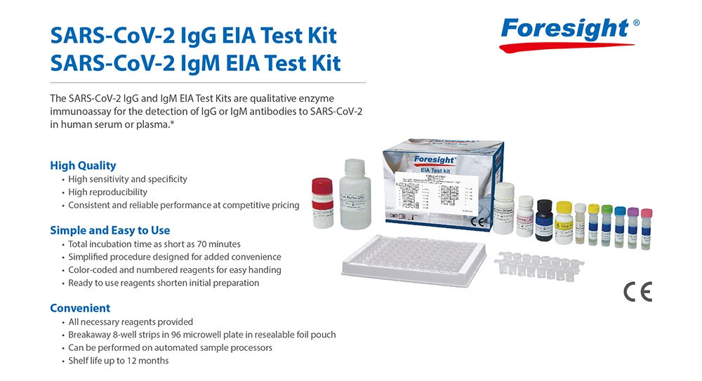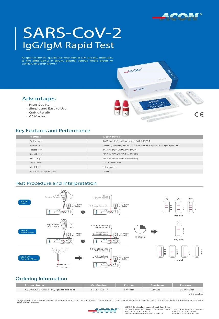 艾康生物新型冠状病毒(SARS-CoV-2)IgG/IgM抗体检测试剂产品具有较高的灵敏度、高特异性、高重现性、简单快速、操作方便、获得CE认证。